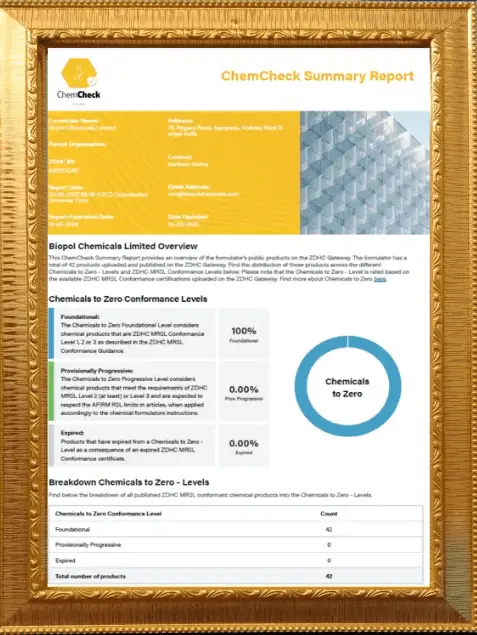 We commit to producing high-quality, sustainable chemical solutions through stringent quality control and environmental responsibility, ensuring customer satisfaction, and regulatory compliance in all processes. Our products are ZDHC Level 3.0 certified.