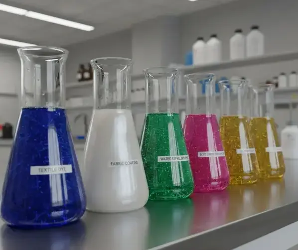 A textile chemical liquid is often discussed alongside binder agents, softeners, and coating auxiliaries used for controlled surface modification and improved finishing results.