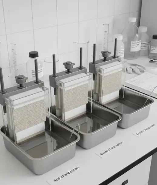 Textile specimens are immersed in ISO perspiration solutions and pressed between filter papers under controlled temperature and pressure.